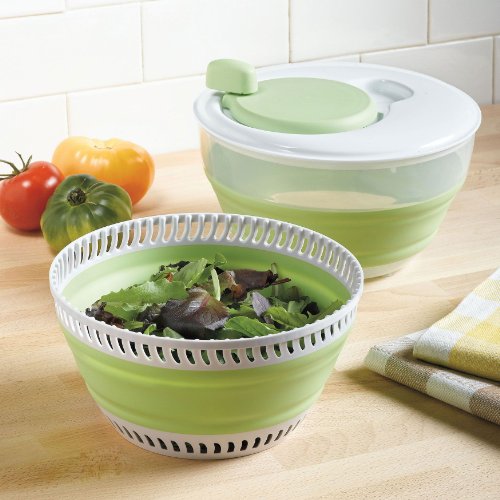 Collapse to store and expand to use this space-saving salad spinner. Great as a salad washer and colander, to strain pasta or serve prepared salads. It does more, with less dishes to wash! 3-qt. capacity. PP/TPE. Dishwasher safe. 3 1/4"Hx9 1/2"Wx9 1/2"D.